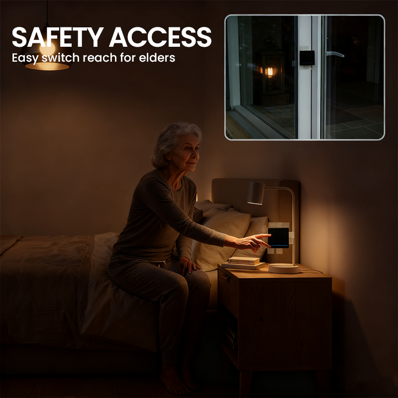 KABELFRI INSTALLATION – Eliminerar behovet av komplexa kabeldragningar i väggarna. Den självhäftande panelen kan placeras var som helst, vilket ger flexibel kontroll och sparar betydande tid och arbete vid elektrisk installation och modifiering.