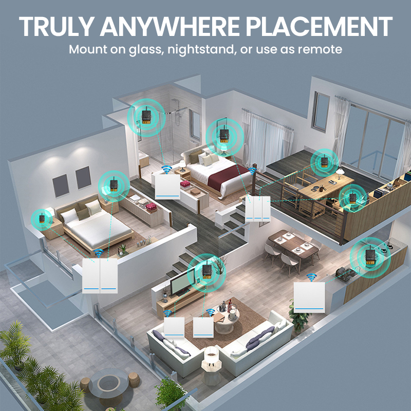 ULTIMAT PLACERINGSFLEXIBILITET - Befria dig från fasta strömbrytare. Montera panelen på glas, placera den på nattduksbordet eller använd den som en bärbar fjärrkontroll för oöverträffad bekvämlighet och tillgänglighet.