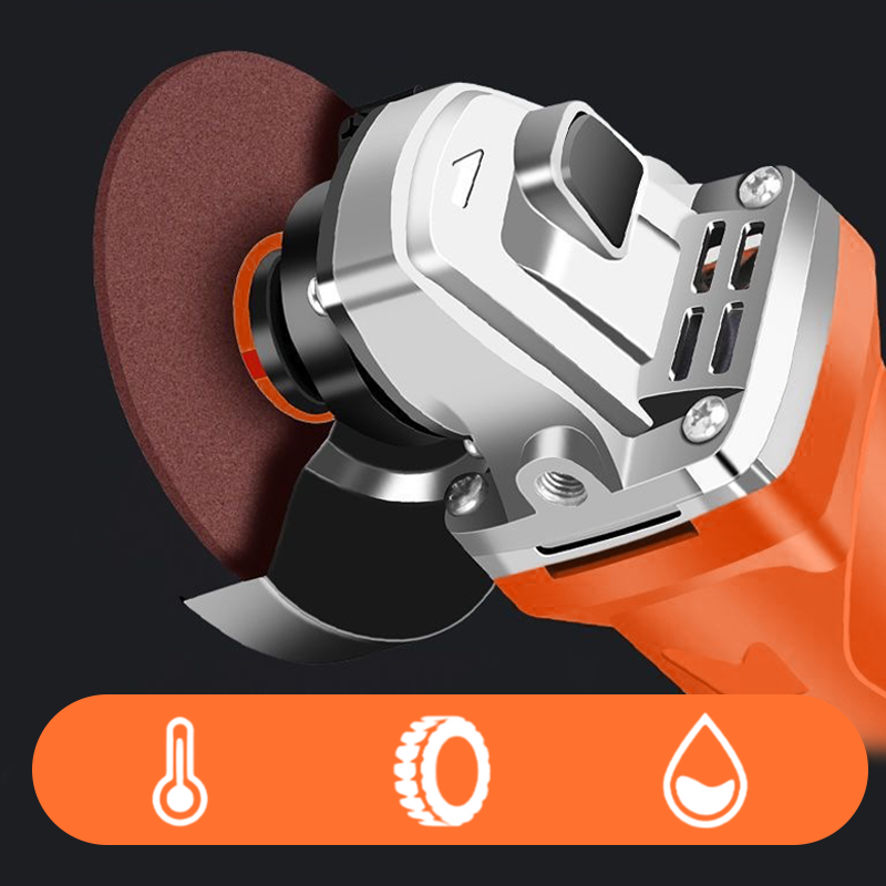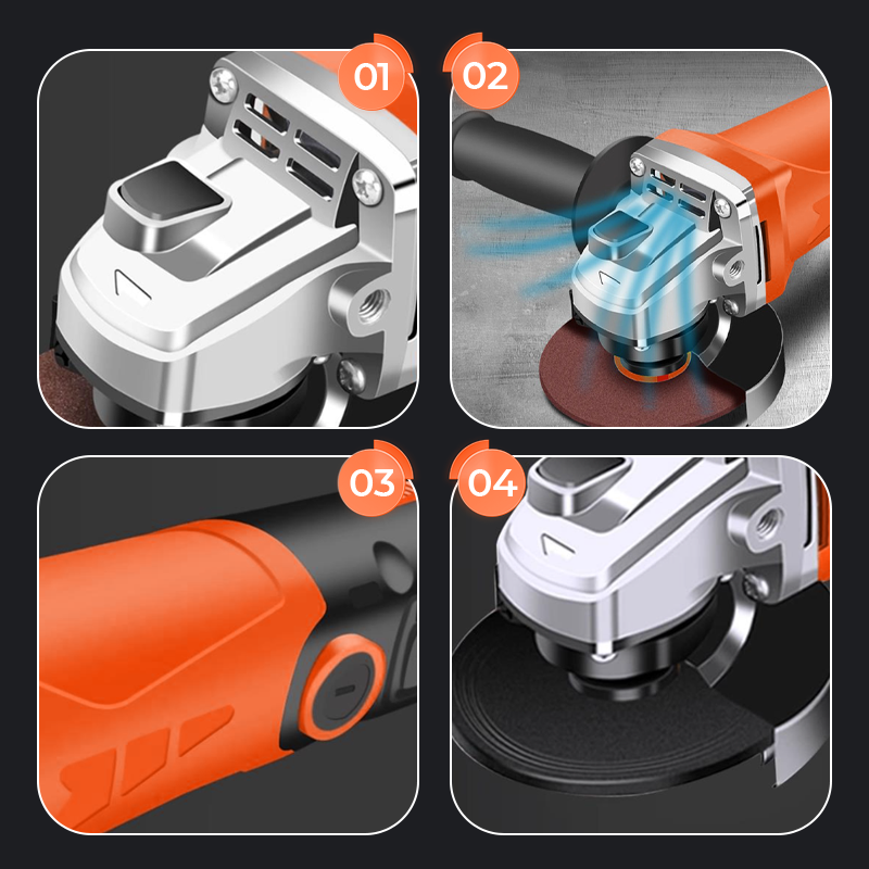 Kylsystem med 360° luftflöde för långvarig drift: Vinkelslipen har en flerriktad ventilationsdesign med en fläkt med stor diameter för att förhindra överhettning. Denna kylmekanism förlänger verktygets livslängd genom att bibehålla optimal motortemperatur under långvarig användning, samtidigt som den minskar dammansamlingen för bättre underhåll.