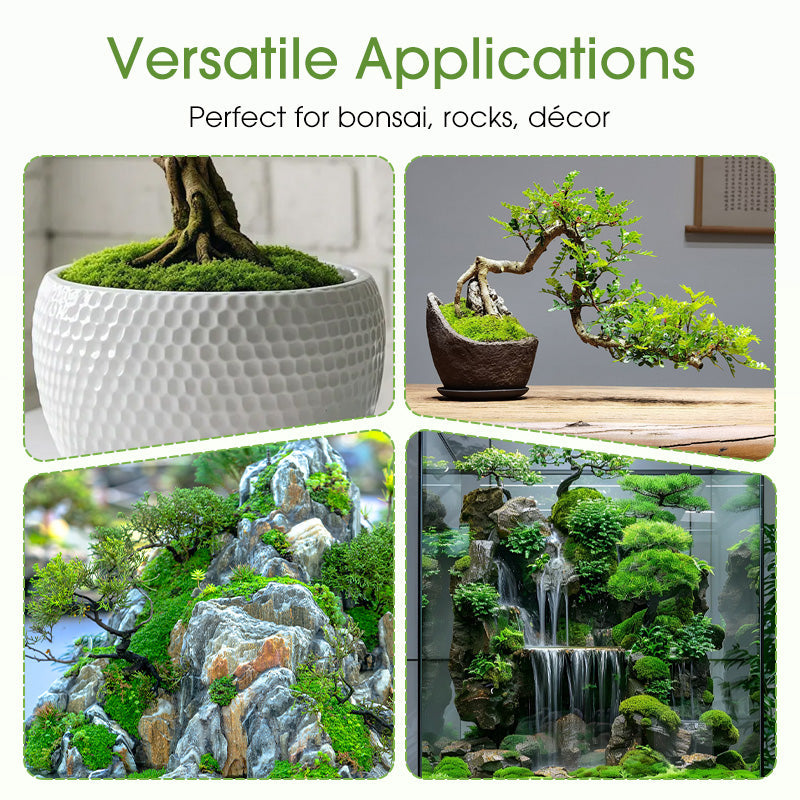 Mångsidig användning i landskap - Perfekt för krukväxter, stenpartier, bonsaibaser eller små dekorativa scener. Den förstärker textur, djup och en naturlig estetik både i hemmet och i professionella miljöer. En liten mängd täcker en stor yta och ger dina utrymmen en lugn, mosstäckt charm.